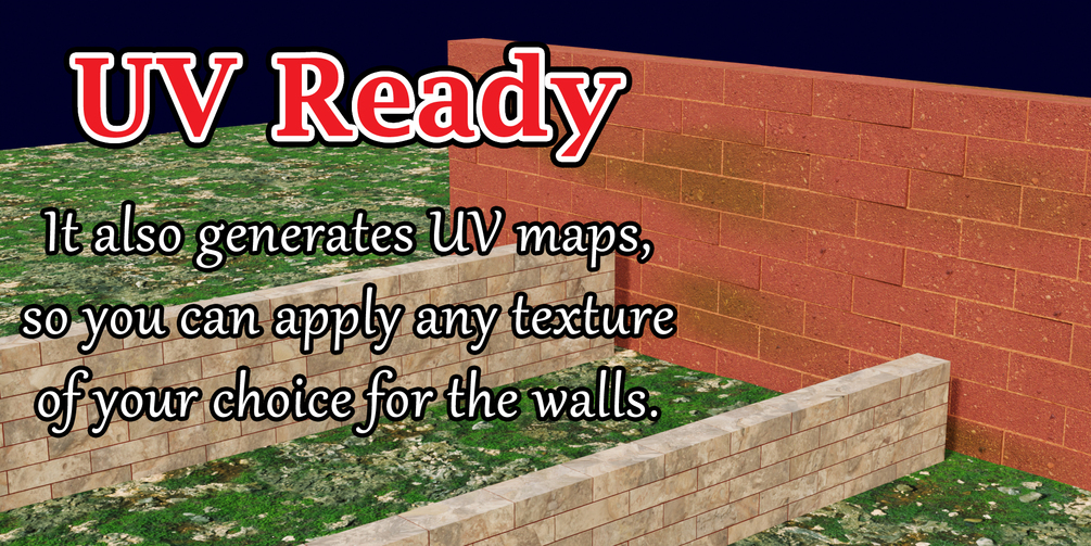 Two separate wall textures are included with this product, and the walls get created along with their UV maps. Which means, you can even add your own textures for the wall. The node will create two materials, one for the bricks and another for the joint. You can customize or even replace these materials if you wish - the UV maps are ready with you! However, these UV maps are generated automatically, not hand-crafted - so we cannot expect them to be flawless. But they are reasonably good for a normal use in a game or in an interior design.